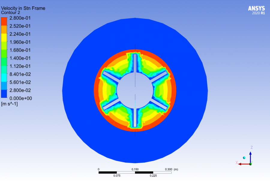 单相水的单个搅拌桨的搅拌釜模拟,稳态计算、MRF、标准湍流模型、标准壁面函数、重力加速度为9.81m/s2,使用标准的K-ε湍流模型,控制方程中的压力-耦合相采用SIMPLE算法,梯度离散化格式设置为“least squares cell Based”,压力离散格式为standard,其余均采用一阶迎风格式。各项收敛残差定为默认的10-3。