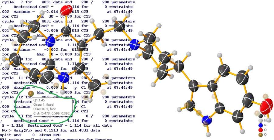 还有Olex2,我一般用Olex2看一下结构,然后还是用shelxtl来精修,Olex2精修部分还没搞明白,只会反复点Refine,我不知道怎么处理这个非氢Q峰,修成氧感觉键长不对,C-O键没有这么短的