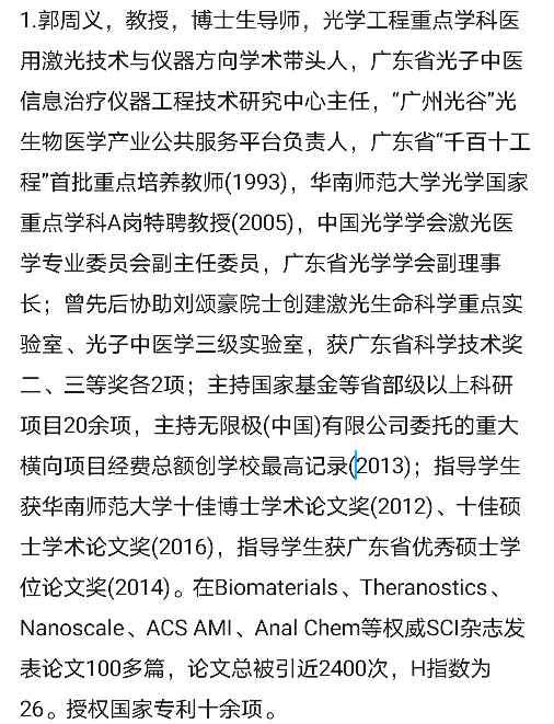 华南师范大学(211)生物光子学研究院郭周义教授课题组招收生物、化学、物理、电子信息自动化等方向调剂生,郭周义教授课题组,成员组成包括:郭周义教授、刘智明副研究员、钟会清副研究员等。