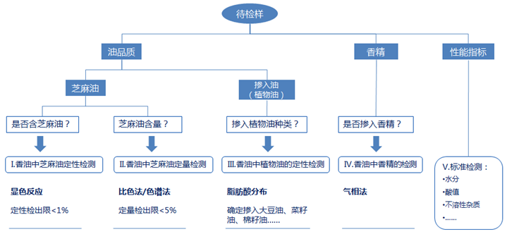 ¡°¼ÙÏãÓÍ¡±µÄ΢Æ×¼ø¶¨·½°¸£ºÍ¨¹ý¶Ô´ý¼ìÑùÆ·½øÐÐÏÔÉ«·´Ó¦ÅÐ¶ÏÆäÖÐÊÇ·ñº¬ÓÐÖ¥ÂéÓÍ£¬Í¨¹ý¶ÔÖ¥ÂéÓÍÖÐÌØÓеÄÎïÖÊ£ºÖ¥Âé·Ó¡¢Ö¥ÂéËØµÈÎïÖʼ°Ö¬·¾ËáÖ¬·¾Ëá×é³É²â¶¨£¬¶Ô´ý²âÑùÖÐÖ¥ÂéÓ͵ĺ¬Á¿½øÐж¨Á¿¡£Í¬Ê±Ö¬·¾Ëá·Ö²¼¼°Ò»Ð©ÆäËûÓÍÖ¬µÄÌØÕ÷ÎïÖÊ£¨È磺çÞ´¼¡¢Î¬ÉúËØµÈ£©½áºÏ΢Æ××Ô½¨Ê³ÓÃÓͿ⣬¶Ô´ý¼ìÑùÖпÉÄÜ´æÔ򵀮äËûÓÍÖ¬½øÐж¨ÐÔ¶¨Á¿¡£´ËÍ⣬ͨ¹ýGC-MS¡¢HS-GCMS¡¢SPME-GCMSµÈÆøÏàÒÇÆ÷¿É¶ÔÑùÆ·ÖеÄÏ㾫³É·Ö½øÐж¨ÐÔ¡£×ۺ϶Դý¼ìÑùÆ·½øÐмø¶¨¡£