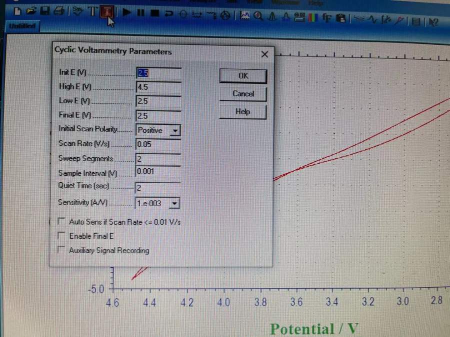 求助,请教下磷酸铁锂正极半电池,想测一下循环伏安曲线,看了几篇文献,设置如图,电压区间在2.5-4.5v,扫描速度用过0.5m/s和1m/s,都不能出现文献中那种两个对称峰,请教一下怎么设置,电池是在化成后,放电完全,静置之后测试的。
