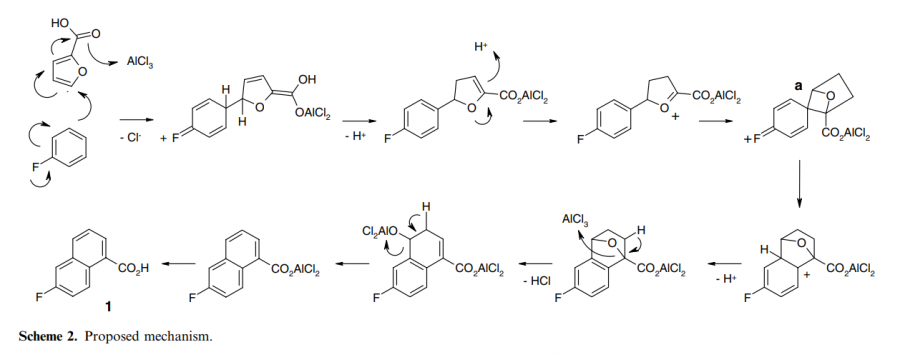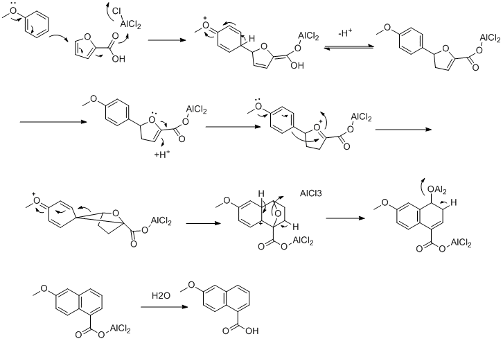 有没有可能呋喃氧和三氯化铝络合以后使杂环失去芳香性,和苯环发生一个D-A加成反应呢?然后再进行后续反应。