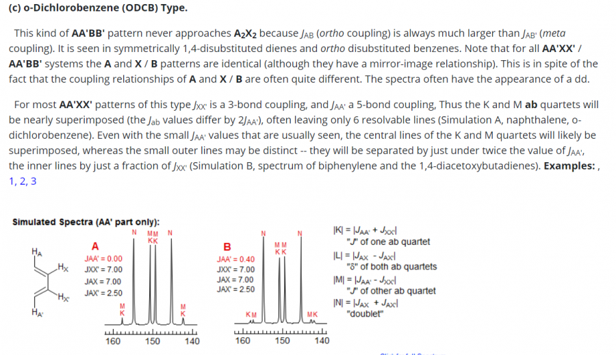 粗看像四重峰,然而并没有这么简单,实际上是两组磁不等价核,AA'BB'系统,根据偶合常数,每组核会裂分多个峰,主要的峰是4个 ,具有dd的外形,但是计算比较麻烦,不是简单加减就能解决的,感兴趣想计算的可以看看附件图片 1.png 2.png 3.png ,