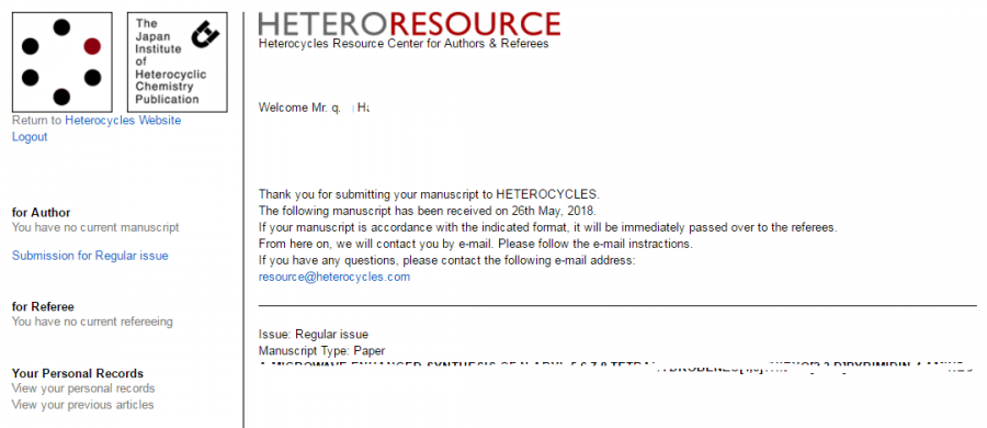 投稿Heterocycles成功,看不到稿件状态,求助大神指点。