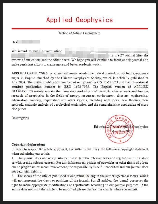 因为投appliedgeophysics期刊不到2个月就收到录用通知,而且是个人邮箱发的,所以向各大神问问
