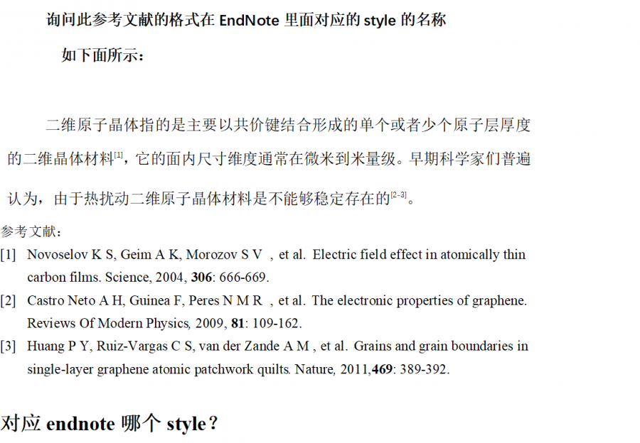 询问此参考文献的格式在EndNote里面对应的style的名称如下面所示:二维原子晶体指的是主要以共价键结合形成的单个或者少个原子层厚度的二维晶体材料[1],它的面内尺寸...