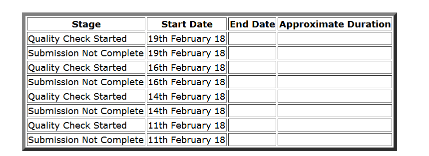 StageStartDateEndDateApproximateDurationQualityCheckStarted19thFebruary18SubmissionNo...