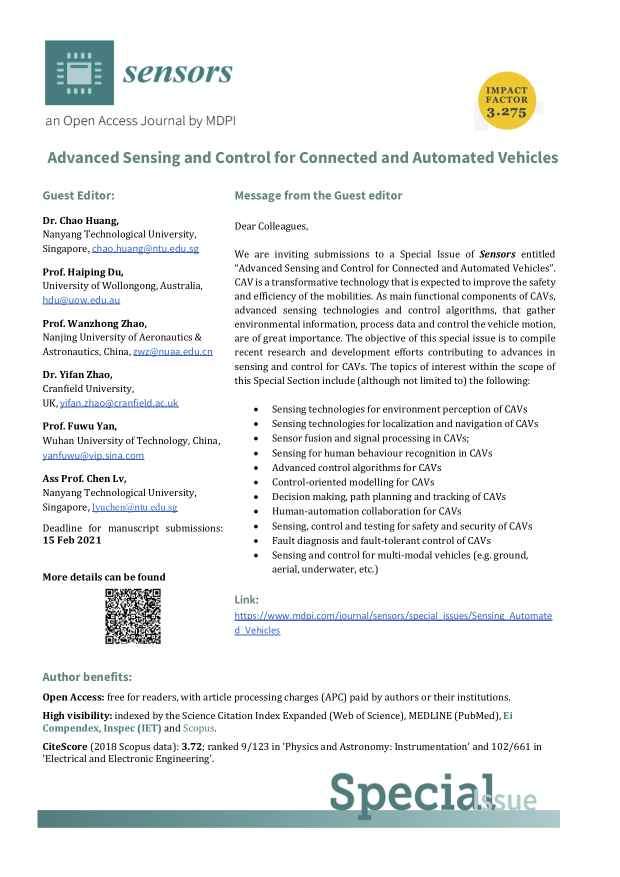 关于无人驾驶的特刊。Sensors(openassess),中科院2020年1月分区大类2区top,审稿速度较快。欢迎投稿!