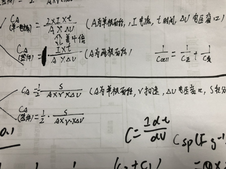 各位大神,根据GCD公式:2*I*t/A*u(A为单根电极活性物质的量)计算比电容,是不是算的是组装成全固态后的单根电极电容,为什么分子上需要乘以2呢?请各位大神指教