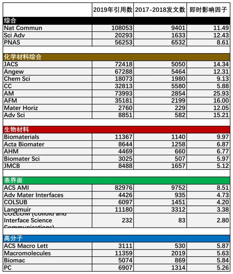 截至2020.01.01部分化学和材料期间即时影响因子