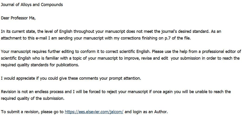 有谁遇到过J.alloyCoumpd.编辑VolodymyrYartys,让我找爱斯维尔润色,花钱润色完了后现在说语言还不合格,还说这是最后一次机会,再不合格就拒稿,我该...