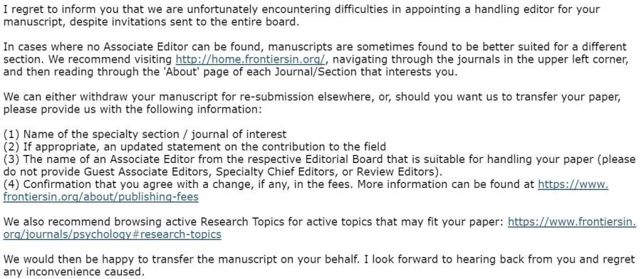 最近投了一次稿,期刊是frontiersinpsychology,结果今晚期刊告诉我没有编辑了,让我推荐编辑或者换板块投稿,我该怎么办,期刊的回信如下,求助有经验的大神指...