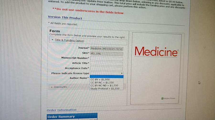 各位前辈,最近有一篇文章被medicine杂志接收,让交版面费,在系统里注册、填信息,想问一下:其中的licensetype有何区别?应该怎么选呢?(附件)谢谢!微信图片...