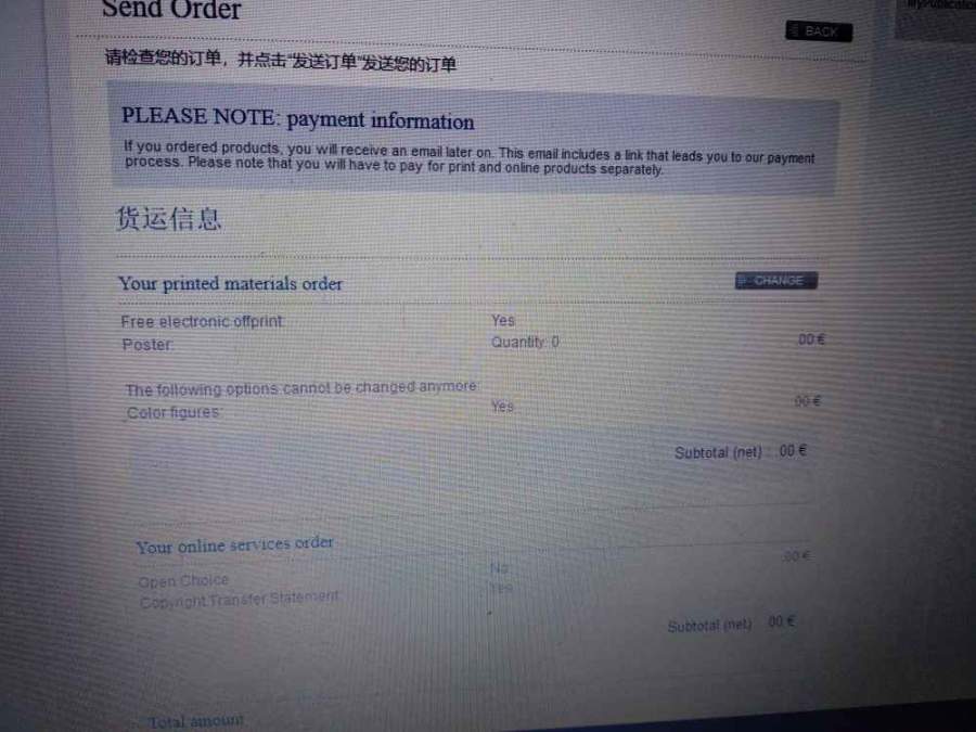 投稿接受之后,我的老师(通讯作者)收到一封邮件,有链接,转发给我之后我点开,按照步骤,最后是在sendorder下选了orderforfree,然后变成Thankyou的...