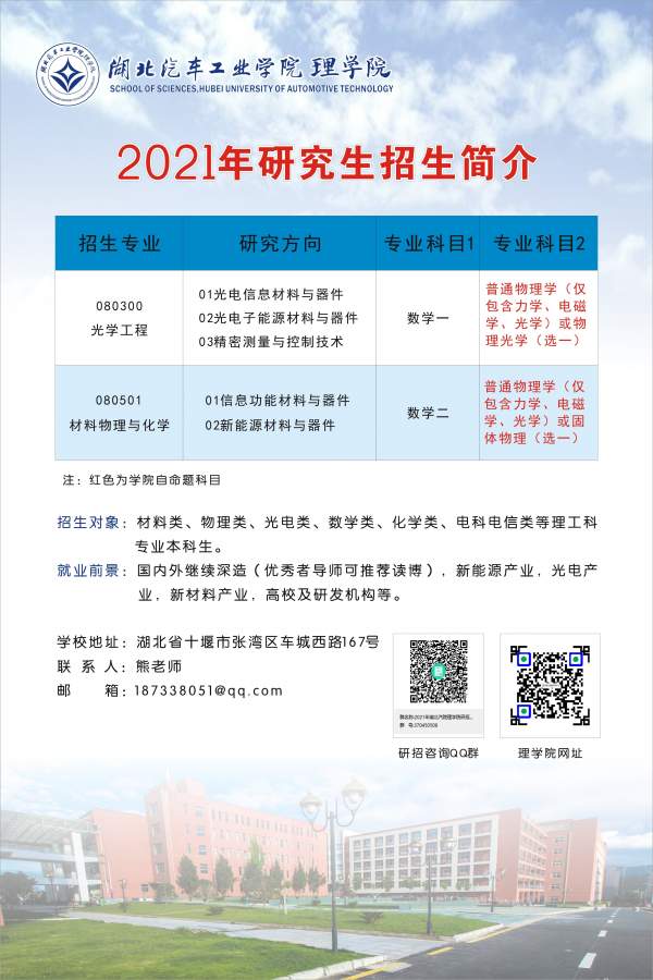 湖北汽车工业学院理学院研究生招生2021两个硕士点光学工程、材料物理与化学,可招收学术硕士。入读硕士研究生生均奖助学金额度可完全覆盖学费与生活费,欢迎大家了解报考!理学院...