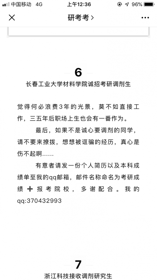 第一志愿为中南大学临床检验诊断,318分,英语70分,已通过四六级,希望能有机会能够调剂。调剂方向:临床检验诊断学,基础医学。联系方式:'837549340qq.com'希望有机会调剂,或者能给出调剂意见,谢谢。