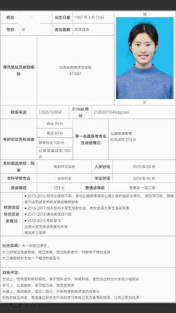 报考专业,心理健康教育专业373分,本科生物科学专业。接受任何相关专业调剂,以下是我简历,经历简单,但踏实认真,学习能力强