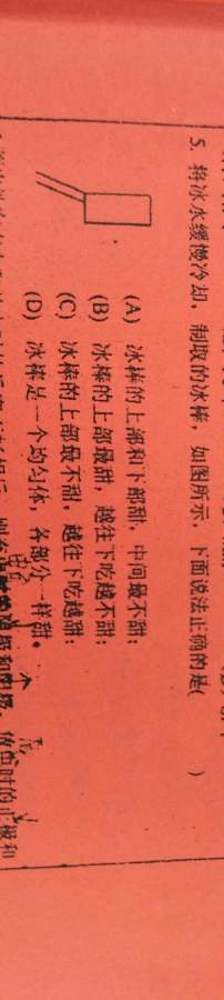 考研题,大家不要用常识判断,我是这么想的,因为冰棒中有溶质,所以凝固点会降低,冰的密度小于水,所以浓度低的部分在上面结冰,所以越往下越甜,不知道对不对,恳请道友解答