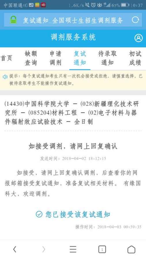 前天晚上出的复试结果显示没被录取,在我准备去其他学校参加复试的高铁路上,研招办打电话说有人不去,我被补录了,给发了待录取通知,这两天真是感觉身体被掏空,再也不想来一次这样的经历,给以后考研学子的忠告,选好一志愿,别走调剂之路,除非本科足够好。不过结果是好的已经...