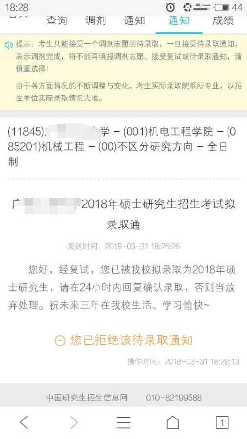 我现在参加了第一志愿和调剂学校的两个复试。两个学校同一天出结果,第一志愿在官网给了拟录取通知,调剂学校在研招网给了待录取通知。我把调剂学校给拒绝了,还会影响第一志愿的录取...