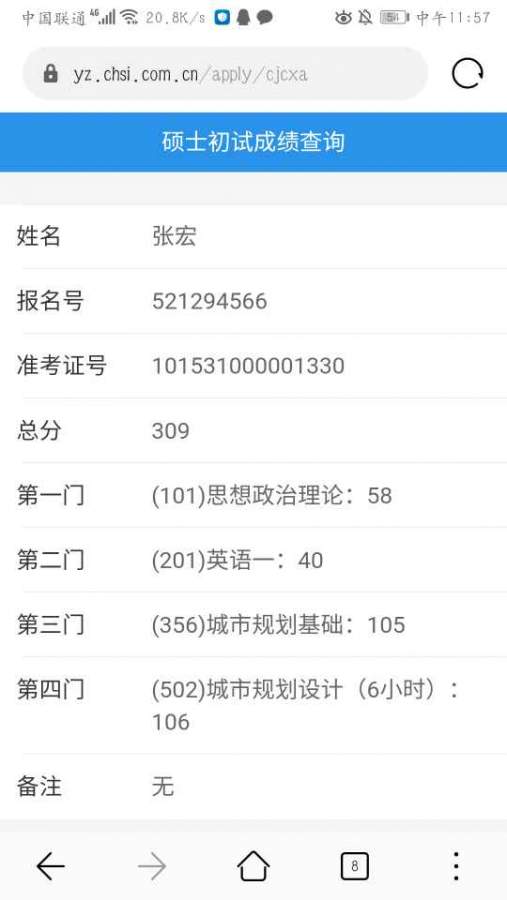 科目:政治:58英语一:40规划理论:105快题设计6小时:106第一志愿:沈阳建筑大学(本人是跨专业考研,原专业是人文地理)由于准备得不够充分,导致了本次考研失败。但有...