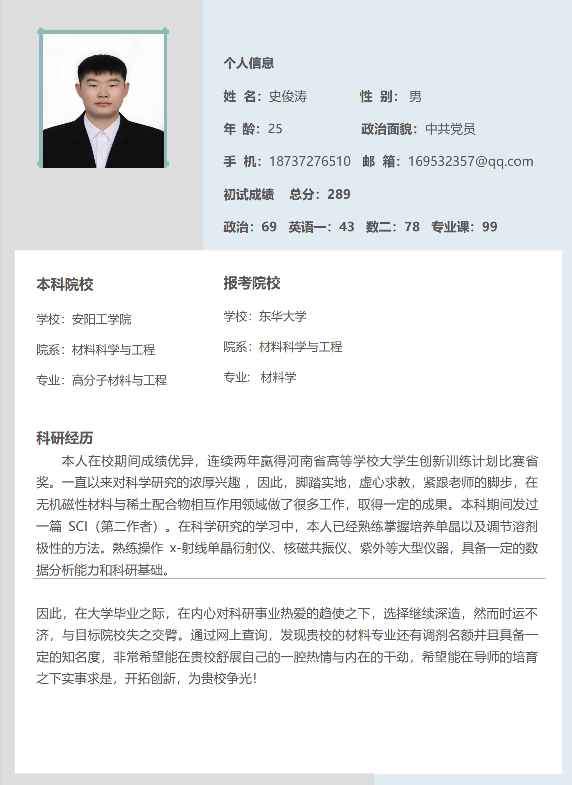 大学期间获得奖学金,三好学生,曾参加互联网+,创新创业等各种比赛,吃苦耐劳,希望能深造,求求各位老师能看上我。微信13437048183邮箱'1359020260qq.com'