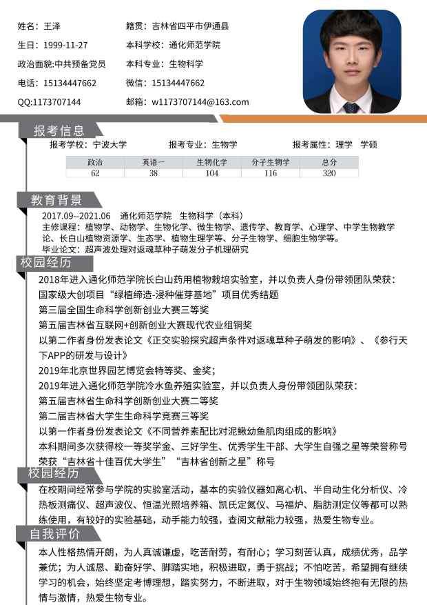 各位老师好,我叫王泽,男,1999年11月生,中共预备党员,籍贯吉林省四平市,本科毕业于通化师范学院,在今年的研究生考试中第一志愿报考的是宁波大学生物学理学学硕,专业课为...