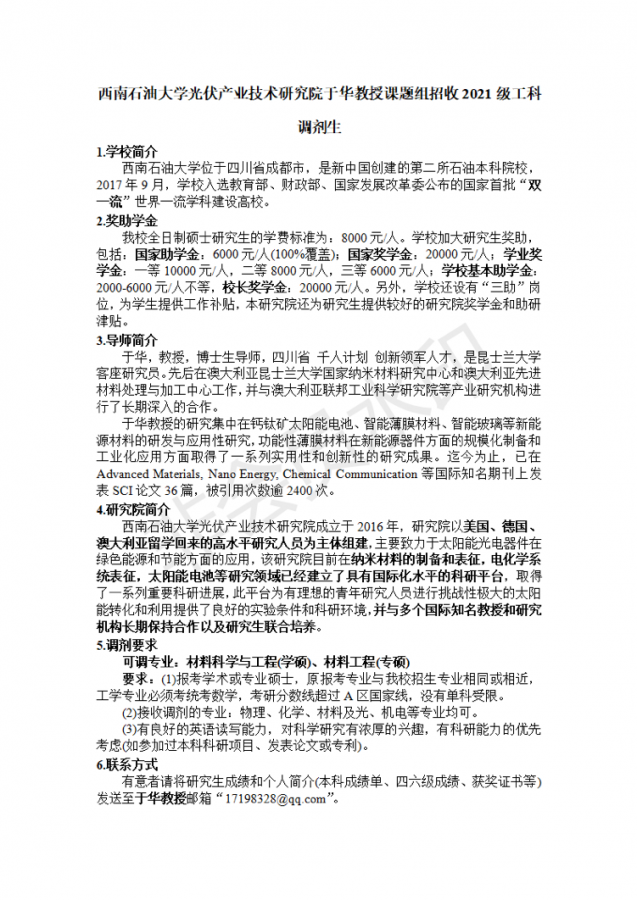 西南石油大学光伏产业技术研究院于华教授课题组招收2021级工科调寄生