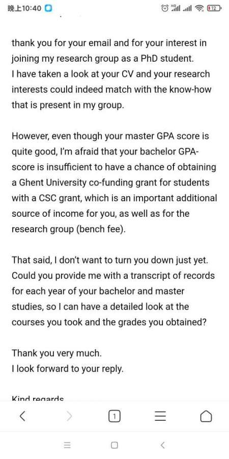 我本科gpa2.57,硕士3.4,这是比利时根特一导师回的。想问下benchfee是啥?还有个问题,本科成绩很low,从绩点就看出来了,发成绩单过去应该就凉了吧?求大神帮...