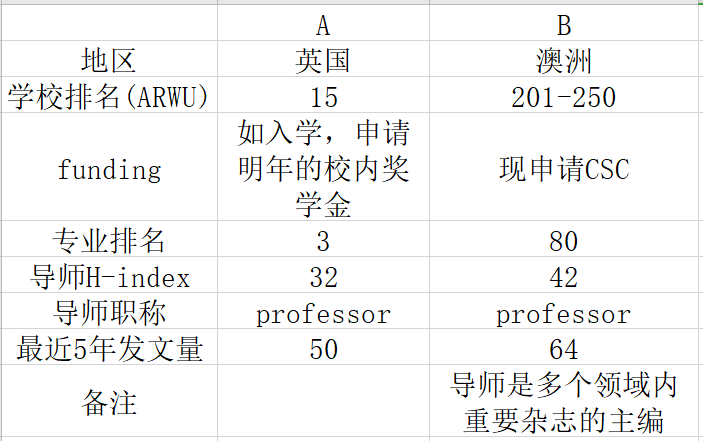 现收到A和B学校的offer,主要对比如图,不知道该如何选择……困扰的原因如下:1.A学校的排名高,因此可能回国找工作会更加容易、找到更好的工作。2.B导师的业内水平比A...