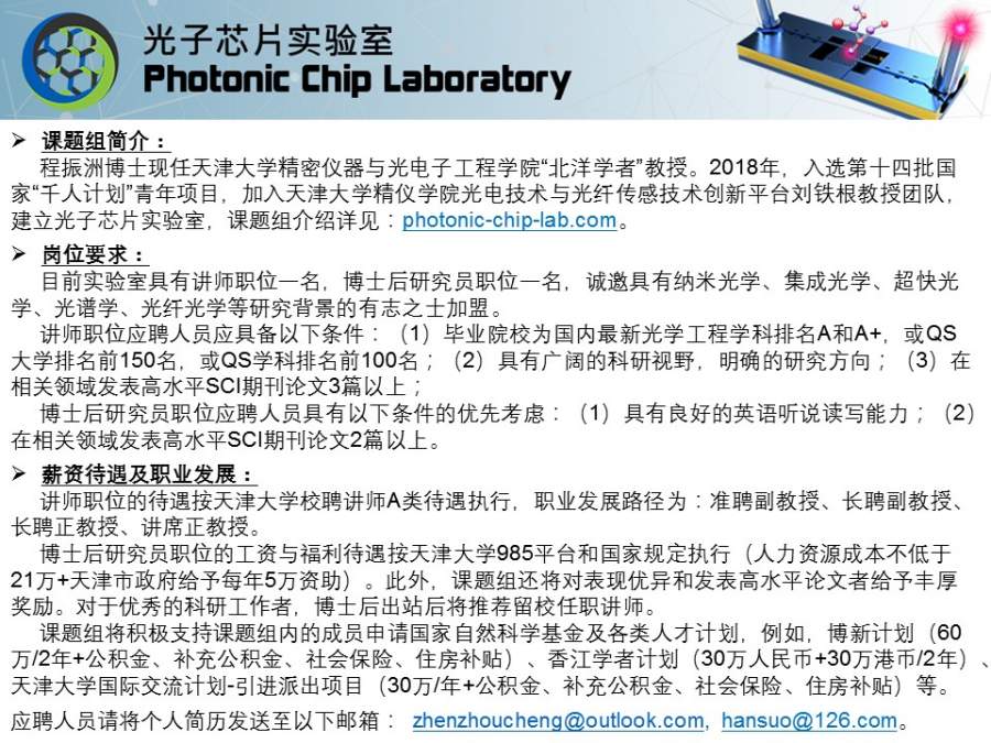 天津大学青年千人课题组诚聘在编讲师和博士后