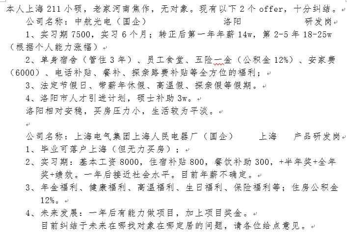本人上海211小硕,老家河南焦作,无对象。现有以下2个offer,十分纠结。公司名称:中航光电(国企)?????????????洛阳???????????研发岗1、实习期...