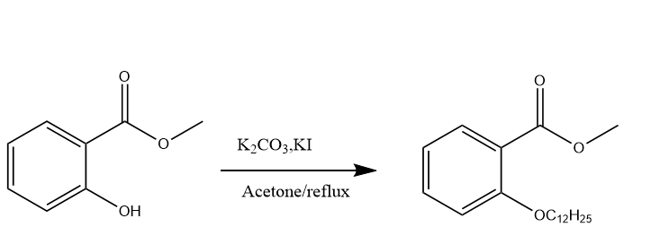 10mmol水杨酸甲酯,30mmolK2CO3、30mmolKI,丙酮作溶剂,常温搅拌1.5h左右,加热慢慢加15mmol溴代十二烷,回流反应?加入1g四丁基碘化铵作相转...