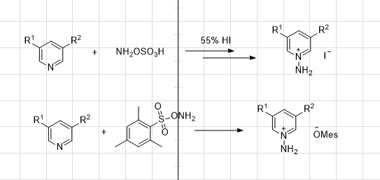 小弟最近在做3,5位取代吡啶和HOSA(羟胺-O-磺酸)反应,拟在取代吡啶N上连一氨基,在后处理加HI欲制成相应的碘盐,冷冻之后拿不到固体。若采用MSH(O-2,4,6-...