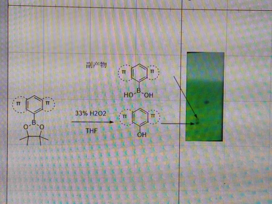 我投了一锅硼酸脂变羟基的反应,条件参考了一篇angew,加过氧化氢和氢氧化钠,核磁分析副产物是硼酸,但是有一个奇怪的现象,随着反应时间长副产物点板子变浓了。大概查了下资料...
