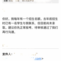 导师已经有人报名,联系她的时候说建议我先报名等审核通过沟通,结果审核通过后直接拒绝。建议大家联系导师趁早啊!貌似图片没PS全我还是把照片删除掉吧[Lasteditedby...