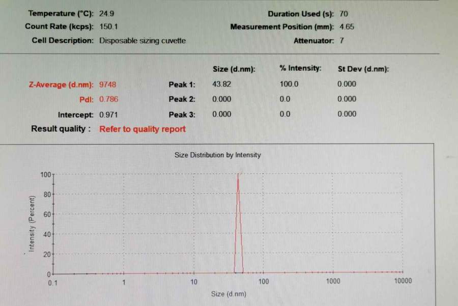 请问大家在使用马尔文粒度仪(NanoZS)的过程中,遇到过以下图所示的情况吗?分布图为单峰分布,粒径约为43nm,但是报告中的平均粒径却为9748nm,而且PDI也很高。