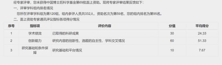 经专家评审,您未获得中国博士后科学基金第69批面上资助。现将专家评审结果反馈如下: 一、评审学科组内排名情况 您所在评审学科组为第154组,组内参评人员共27人,资助...