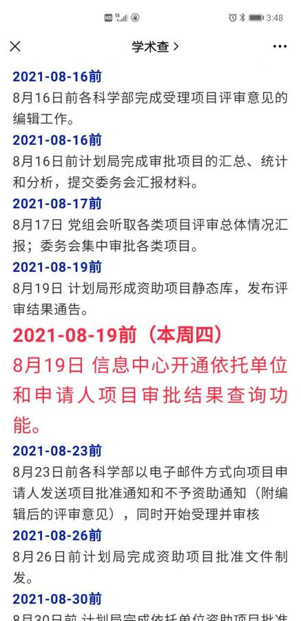 2021-08-16前8月16日前各科学部完成受理项目评审意见的编辑工作。2021-08-16前8月16日前计划局完成审批项目的汇总、统计和分析,提交委务会汇报材料。20...