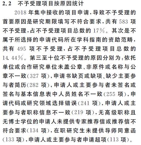 2018年集中接收的项目申请,导致不予受理的首要原因是研究期限填写不符合要求,共有583项不予受理,占不予受理项目总数的17%。其次是不属于所选择的申请代码所在学科指南的...