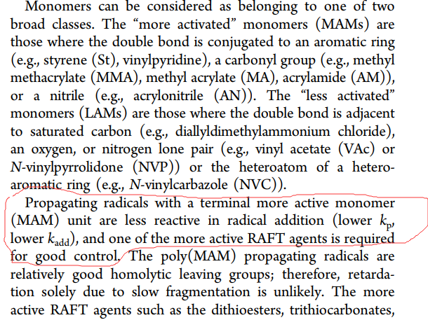 圈出来那句话应该怎么理解呀,为啥Propagatingradicalswithaterminalmoreactivemonomer(MAM)unit会是较低的自由基反应活...