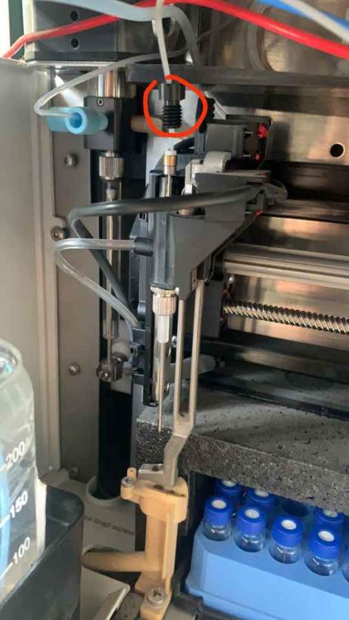 waters2707自动进样器,进样针因为样品盘没放好,扎歪了,联系按照工程师后建议自己手动掰直进样针,将针慢慢往上顶,但是在往上顶针的时候,如图塑料螺丝不慎掉落,现在找...