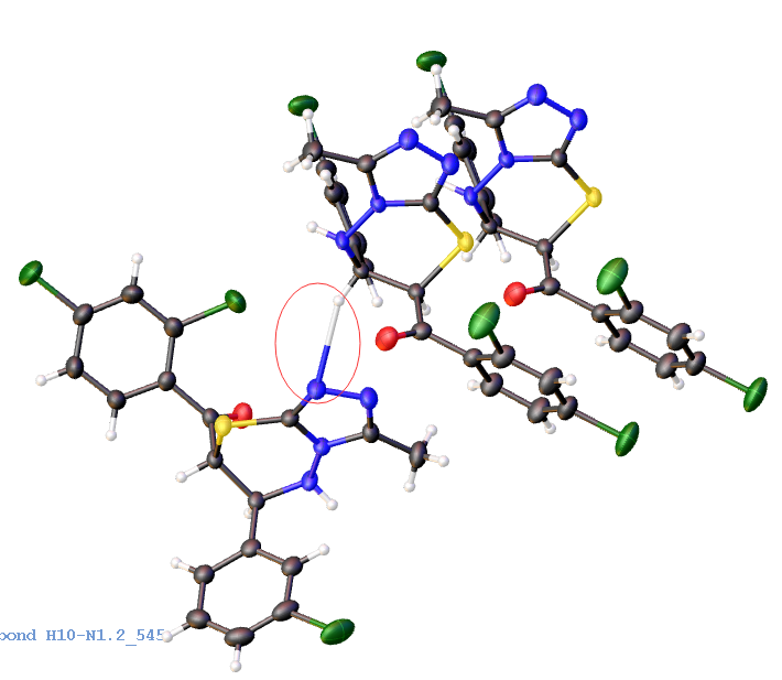 各位朋友:本人有一个晶体,里面存在非经典氢键,但是olex2软件不显示该氢键,我就击右键,creatbond,创建了一个新键,将其连接起来,但是显示的不是虚线,而是正常的...