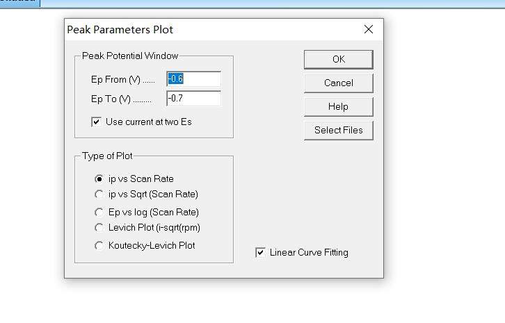 真的是不想每次的图都要在Origin里分析,CHI明明自带这个功能,我把电位取了峰电流电位的区间,然后Selectfiles,接着用Ctrl键同时选了3个文件,结果就是图...