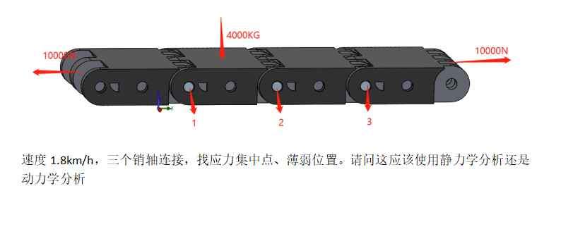 速度1.8km/h,三个销轴连接,找应力集中点、薄弱位置。请问这应该使用静力学分析还是动力学分析