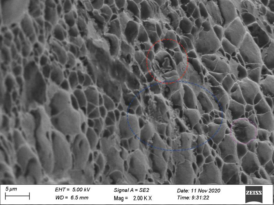 红色圆圈中韧窝内部好像长出了一个小韧窝,是第二相析出的因素么,粉色圆圈和蓝色圆圈与红色圆圈是一样的么,只是长大的不同阶段?08.jpg