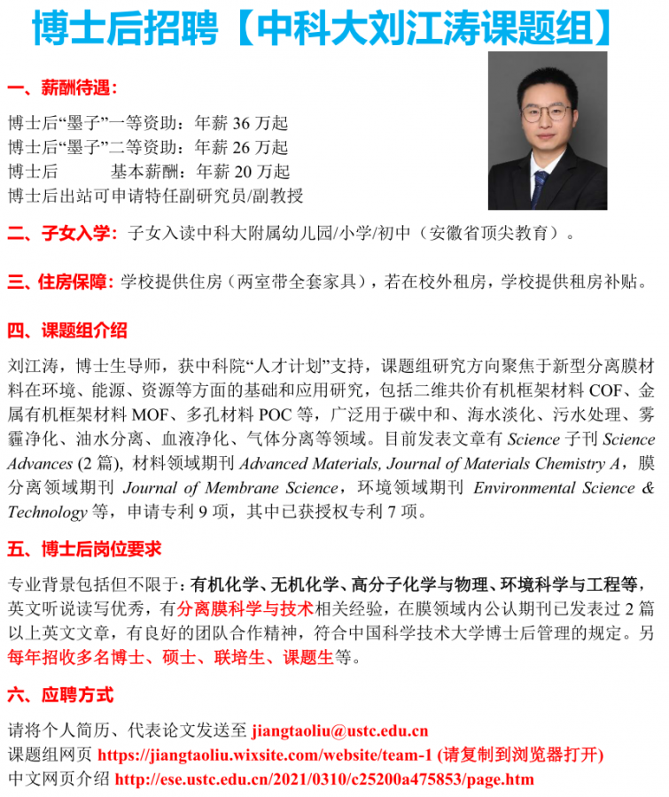 【中科院百人组招博后】中科大刘江涛组招分离膜环境能源方向博后