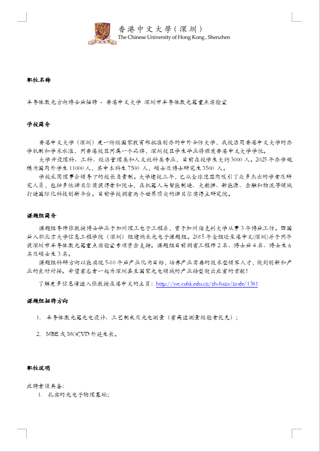 香港中文大学(深圳)招聘半导体激光方向博士后