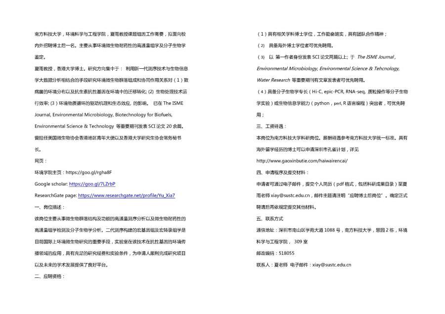 南方科技大学生物系欧西军课题组诚聘博士后和科研助理