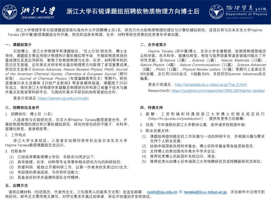浙江大学物理系招聘软物质物理方向博士后 (与日本东京大学联合培养)